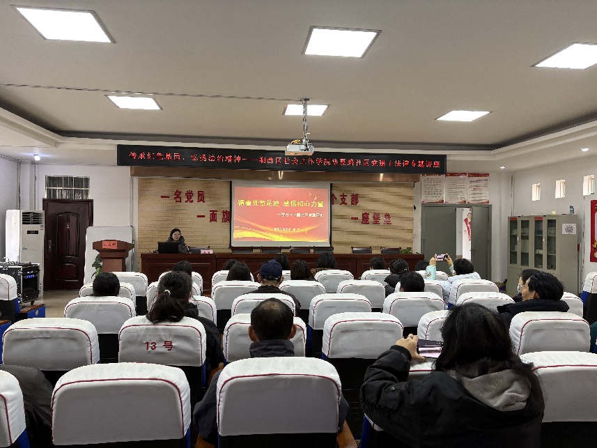 为深入传承红色基因,筑牢法治思想根基,12月19日上午,我校骨干教师崔岩、郑延培走进涧西区社会工作学院华夏路社区,开展红色教育暨法律知识普及讲座活动,吸引了众多辖区居民参与。 活动现场,崔岩老师首先以《循着党章足迹 感悟初心力量》为题开展红色教育讲座。讲座中,崔老师围绕党章的发展历程、核心要义与时代价值展开,结合党的百年奋斗历程中的典型事例,生动阐释了党章作为党的总章程的重要意义,深入解读了党章中蕴含的初心使命与责任担当。通过梳理党章在不同历史时期的修订与完善,带领在场社区工作人员与社区居民重温了党的光辉历程,感受了革命先辈们坚守信仰、践行初心的崇高精神,进一步深化了大家对党的理论与路线方针的理解,坚定了听党话、跟党走的信念。